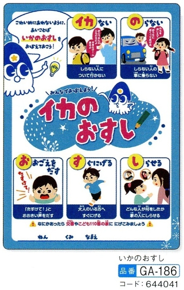 イベントワン HOME へ お子様のための 交通安全グッズ いかのおすしA4下敷き いかのおすしA4下敷き 画像をクリックすると拡大されます。 ぼうはんのやくそくが入ってる下敷きです。 5つのやくそくのが印字されています。 申込番号:GA-186 644041 価格 1個 165円 税込 (本体価格 150円) この商品のお問い合わせ ご注文の際は、以下の点をご理解いただきますようお願い申し上げます。 商品画像は、撮影時の光の関係やお使いのパソコン環境により、実物と異なる場合があります。 また商品改良のため、予告なく仕様を一部変更する場合がございます。 当社の交通安全グッズは交通安全を目的とし企画された商品ではありすが、お客様の安全を保証するものではありません。 カテゴリー 交通安全キャンペーン お子様のための交通安全グッズ 交通安全反射キーホルダー 交通安全グッズ反射材付きバッグ 交通安全反射シール 交通安全広報用品交通安全のぼり旗 交通安全ミニ横断幕交通安全反射電柱幕 交通安全反射タスキ 歩行者のための交通安全グッズ 交通安全広報用品交通安全表示板 交通安全マグネット 交通安全飲酒防止グッズ さすまた不審者・侵入者から身を守る! 交通安全コラム 交通安全に関してのコラム記事です。 交通安全コラムはこちら → 社長紹介 坂尻 寿彦 まじめなことを書いても似合いませんし為になる事も書けません。 自分らしく書いてみたいと思っています。 靴やカバンそして食べる事は大好き、いいかげんな事ばかりですが、お暇なときにお付き合い下されば幸いです。 社長ブログ → 営業日カレンダー ×は休業日です。