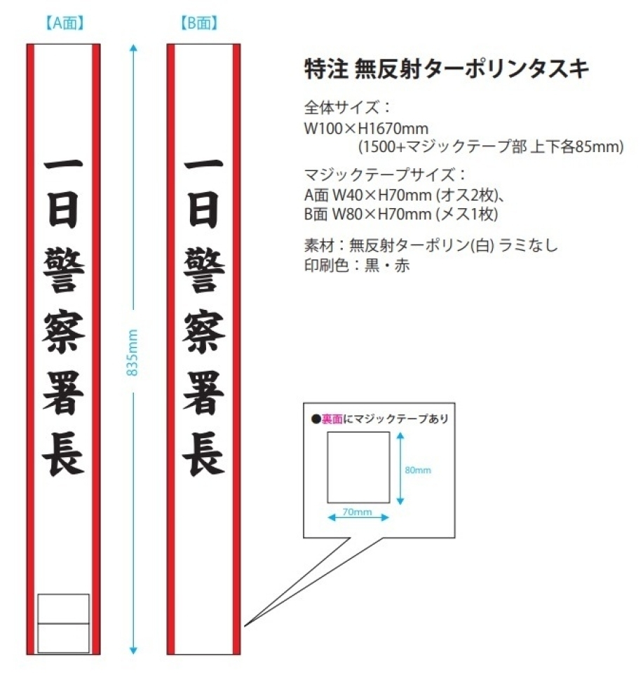 ●マジックテープサイズ:A面 W40×H70mm (オス2枚)、B面 W80×H70mm (メス1枚) ●このタスキ(一日警察署長の文字の上)にキャラクターを入れて欲しいとの要望がございます。1枚だけで印刷すると印刷代が高くなってしまいますので当社ではご希望のキャラクターのデータを頂ければ透明シールにて印刷し貼り付けて納品する事も可能です(別途550円税込み)